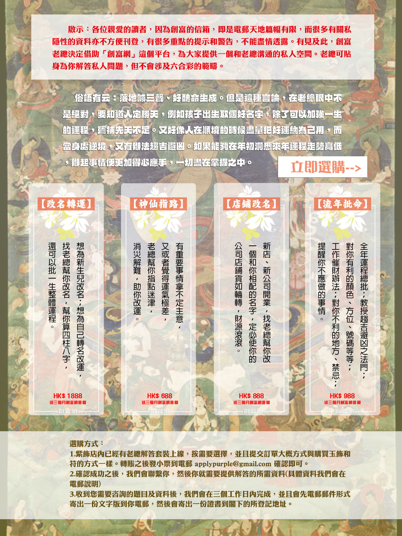 「動悉先機」已再度登場。「癸卯兔年海報」、「兔年開運符」和「兔年太歲符」已經推介,大家可登入《紫飾店》purple-gold.com選購。